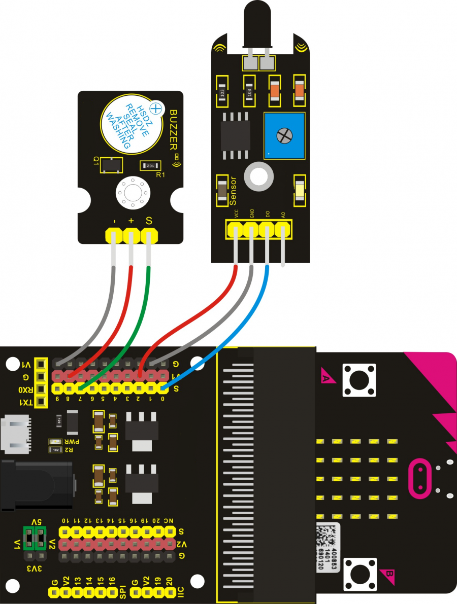 El sensor de llama permite detectar fuego u otras fuentes lumínicas con una longitud de onda comprendida entre los 760 nm y los 1100 nm. Su ángulo de detección es de 60º, pero se puede regular el potenciómetro incorporado para mejorar la precisión. Como en una práctica anterior, vamos a ver cómo utilizar este sensor para que el zumbador emita una señal en caso de detectar una llama.