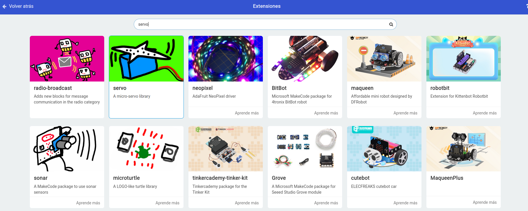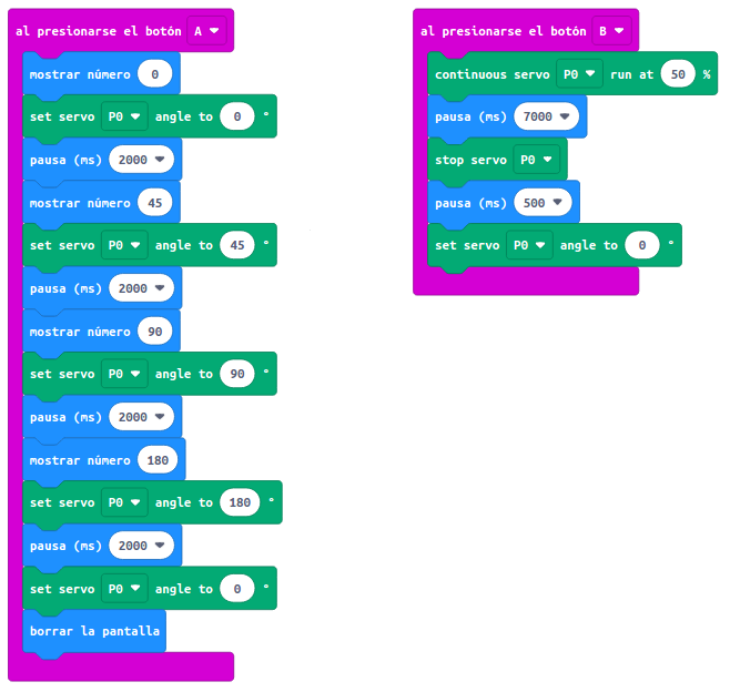Para programar este actuador, puedes realizar el siguiente código en la plataforma MakeCode. Una vez completado, descárgalo en micro:bit, insértala en la placa de expansión y comprueba que funciona correctamente.