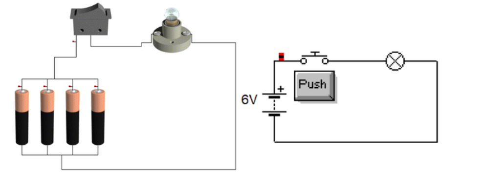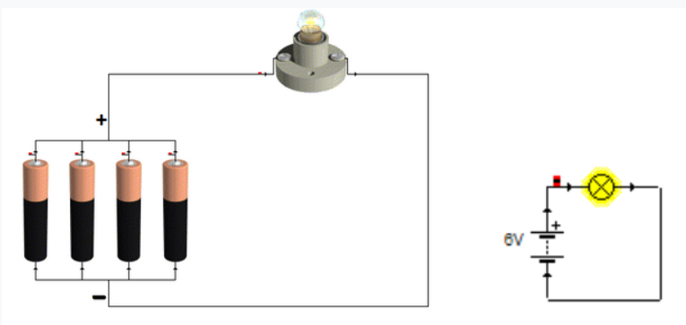 Realizar la conexión de una bombilla en la protoboard alimentada por un portapilas de 4 pilas de 1,5 v tipo AA. Según el siguiente circuito.