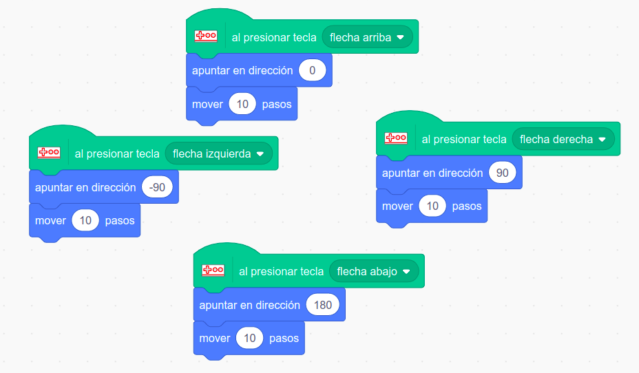 Los bloques de programación para controlar con el teclado el movimiento de un objeto en los ejes x-y pueden ser los siguientes: