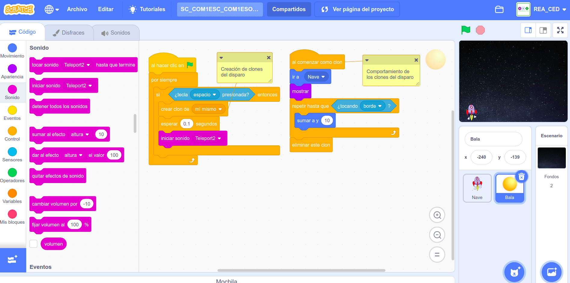 Una vez creados los objetos disponibles en la galería de Scratch; la nave y el disparo que puede ser una bola de tamaño pequeño, se programa el movimiento de la nave y los bloques del disparo aprovechando los clones.