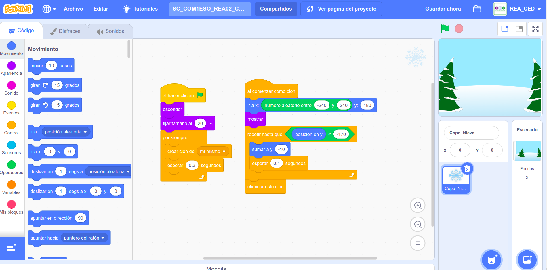 Vamos a ver los bloques de programación utilizados para crear una nevada compuesta por copos de nieve aplicando los clones en Scratch.