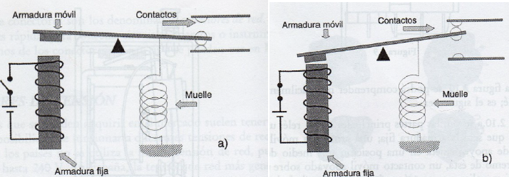 El relé es un interruptor que conecta o desconecta un circuito mediante un electroimán. Este dispositivo está formado por un electroimán (bobina de hilo de cobre aislado más un núcleo de hierro dulce), un sistema de palancas que son atraídas o no según se alimente al electroimán con una corriente.