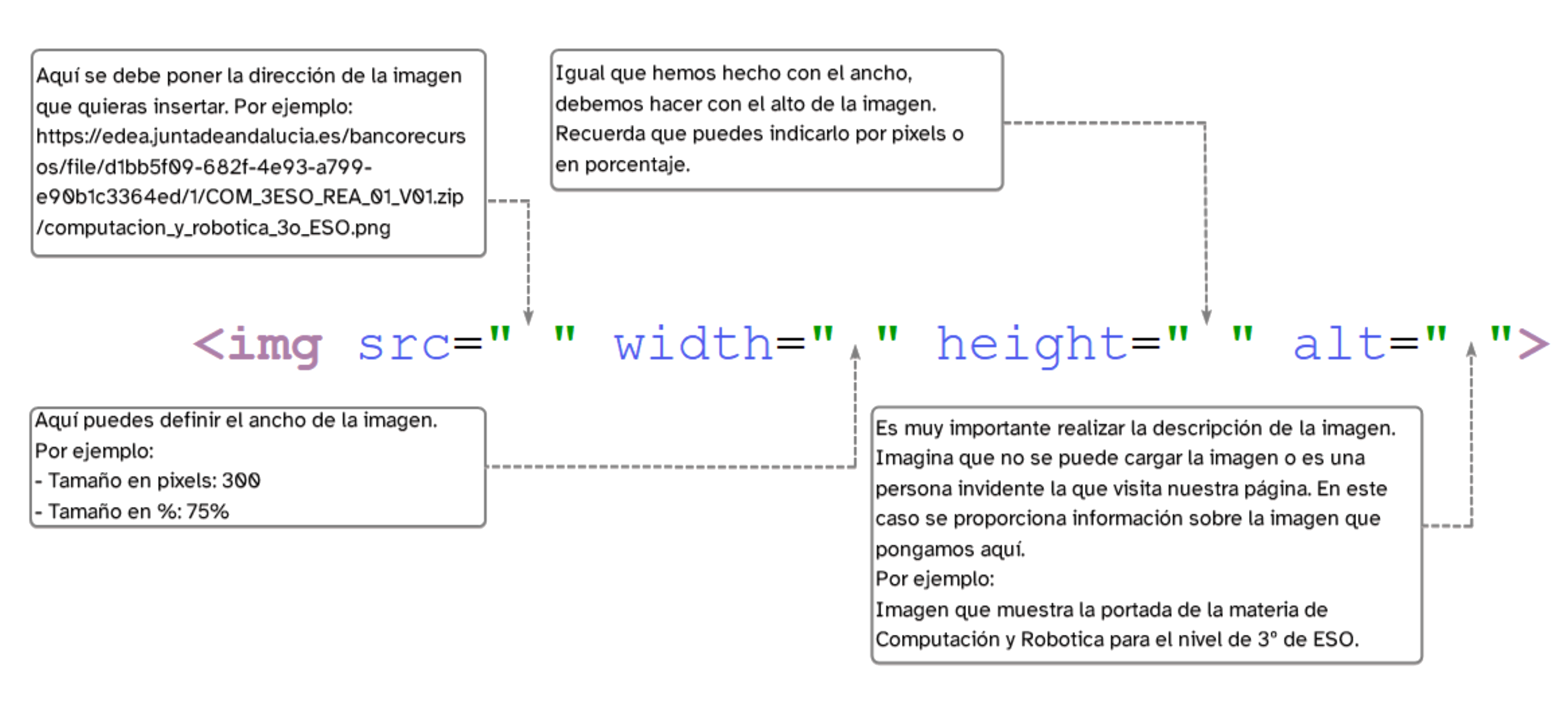 Recuerda que podemos añadirle las dimensiones con la que queremos que se muestre la imagen con width y height y en alt una descripción. Por ejemplo: