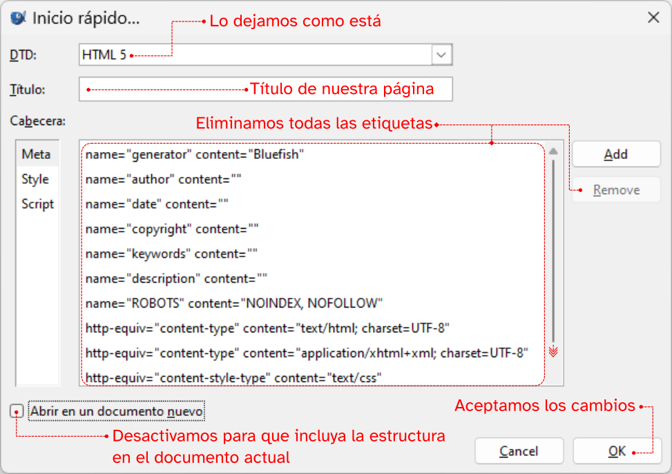 Para los títulos, en la aplicación Bluefish, también existe un atajo que facilita la escritura en HTML.