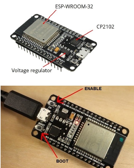 El chip ESP-WROOM-32. Tiene un regulador de voltaje de 3,3 V que reduce el voltaje de entrada para alimentar el chip ESP32. También incluye un chip CP2102 que permite conectar el ESP32 a la computadora para programarlo.